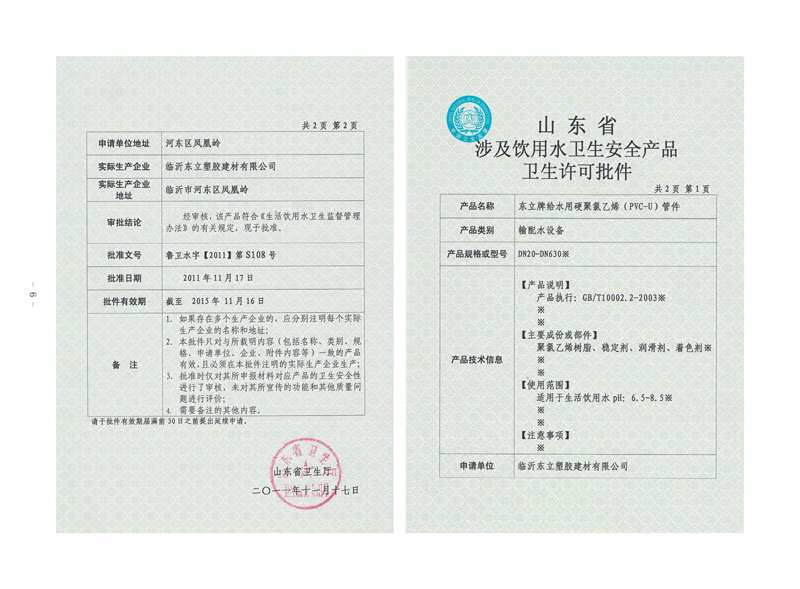 山東省涉及飲用水衛生安全產品衛
